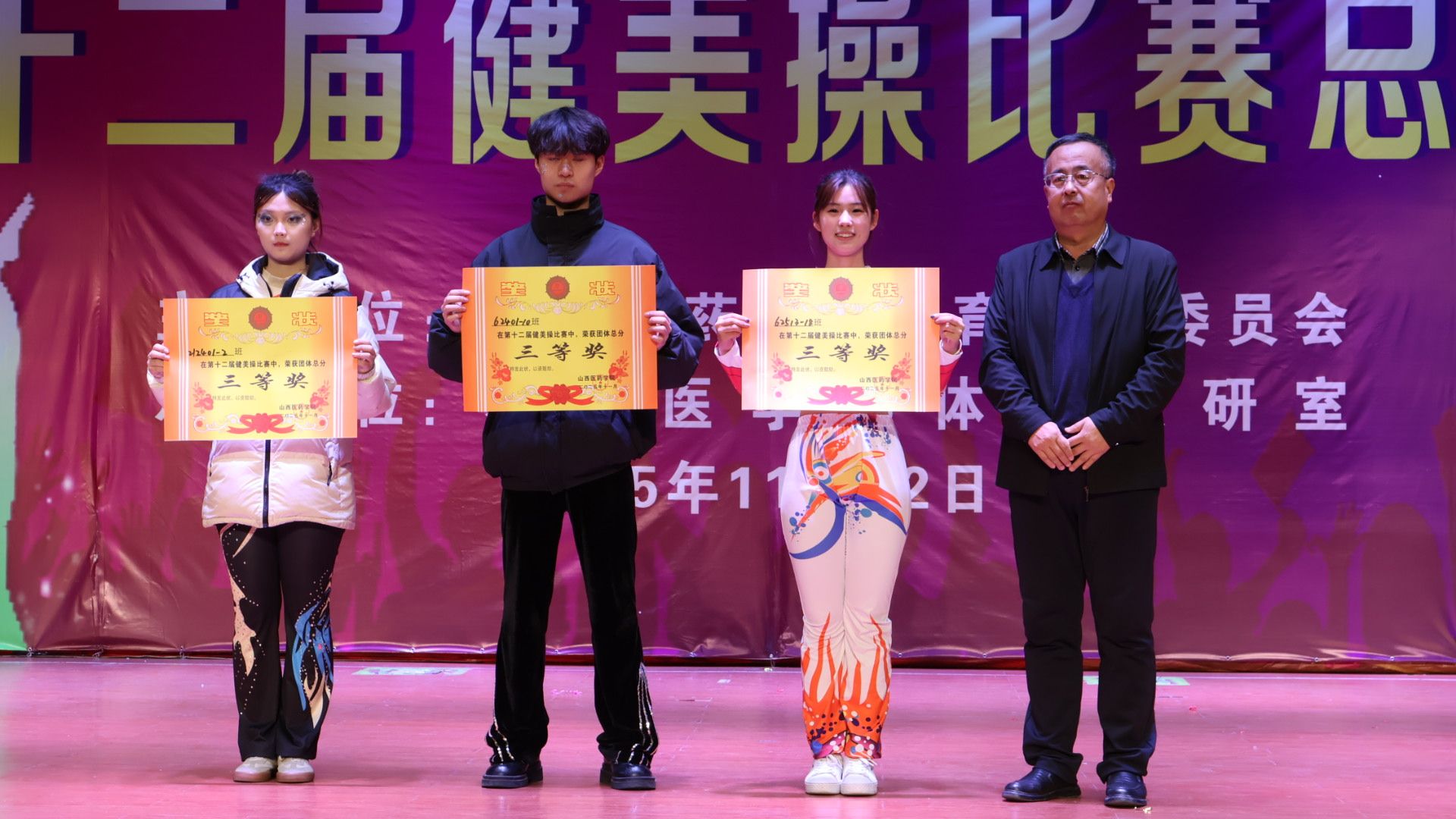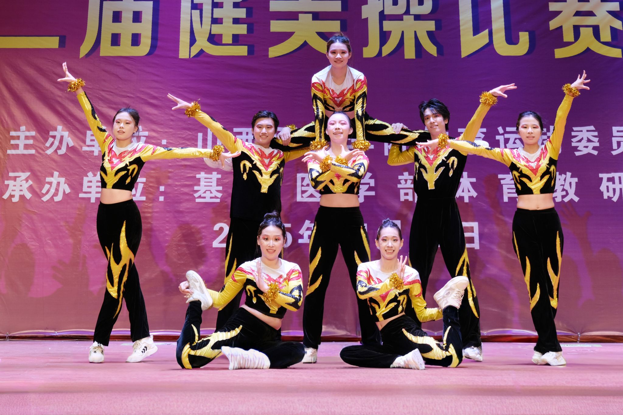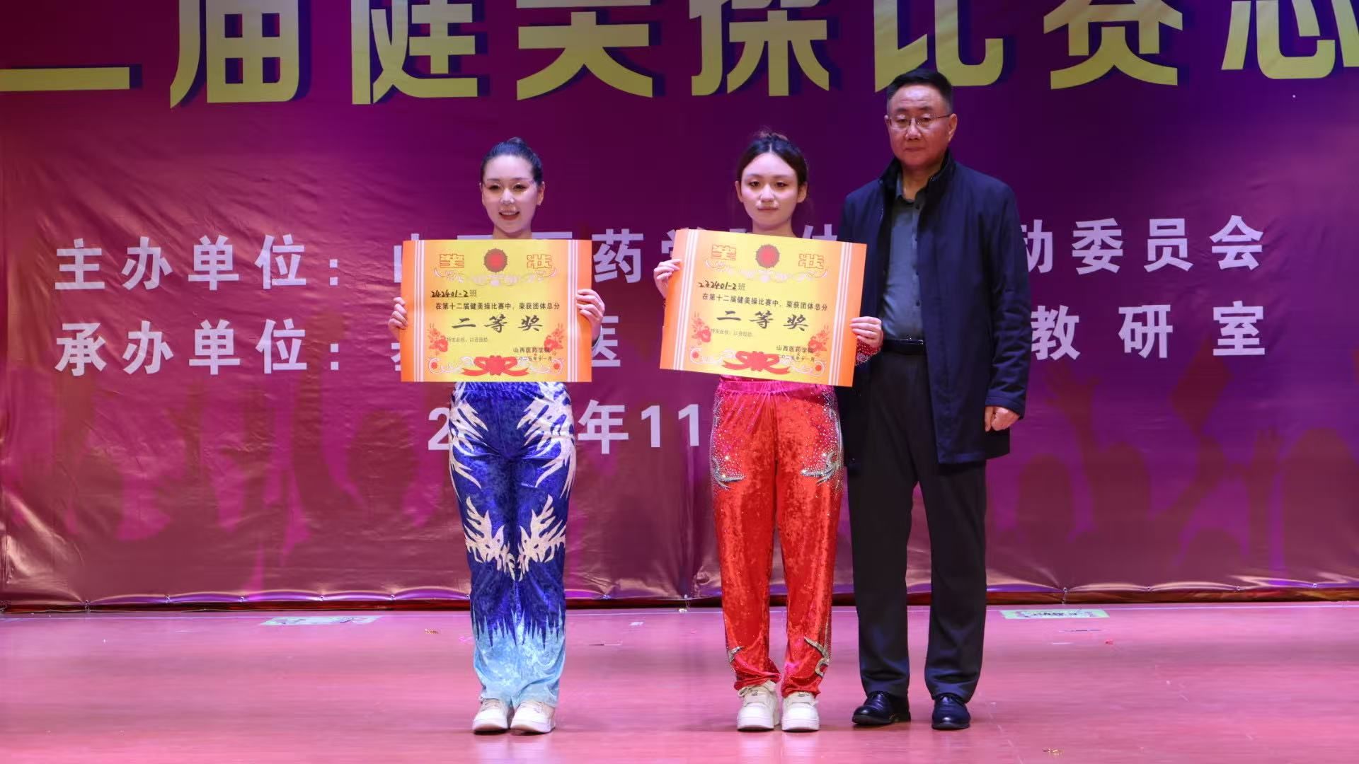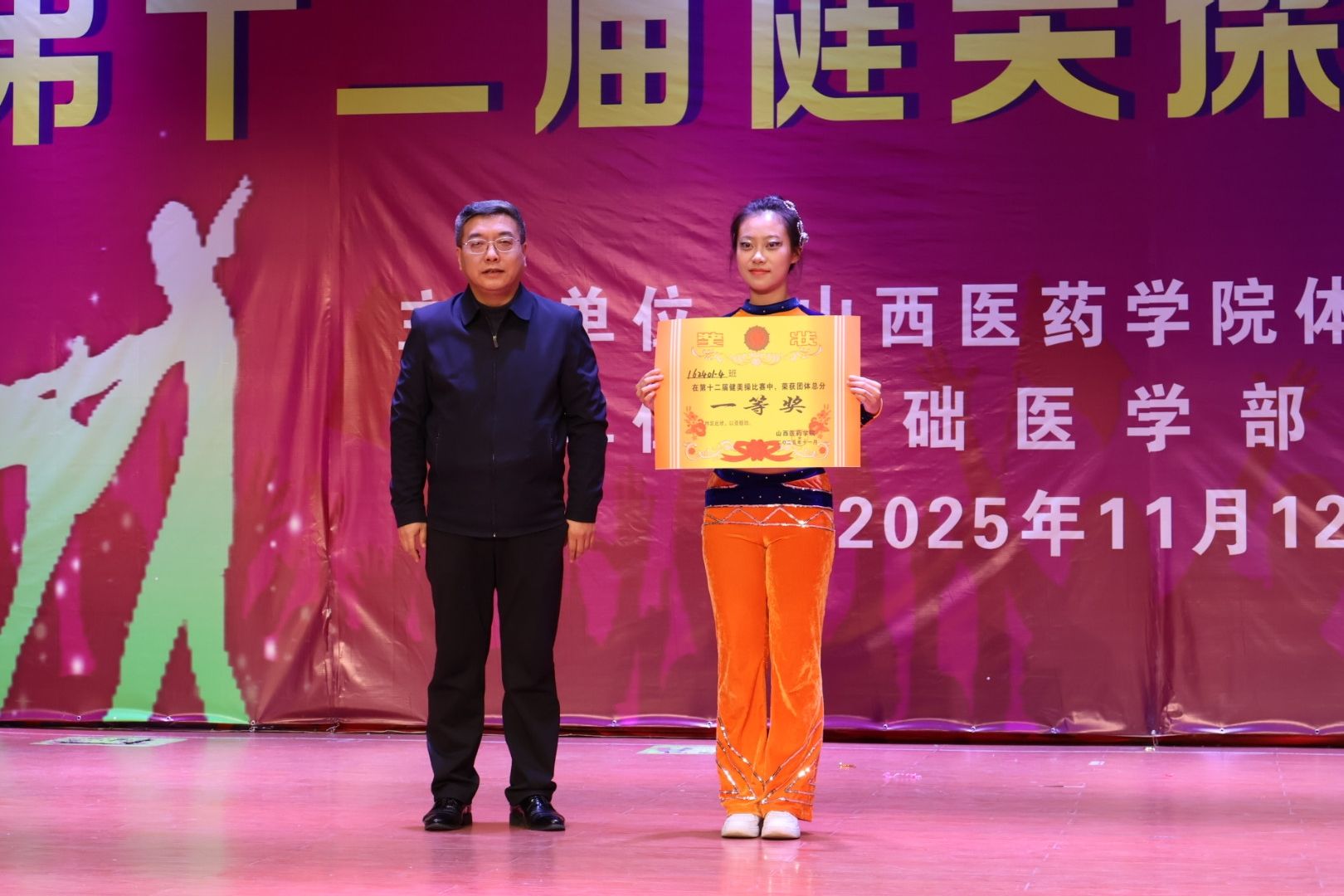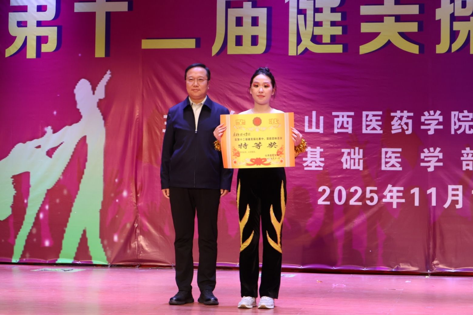 舞动青春,绽放活力。为认真贯彻落实习近平总书记关于加快建设体育强国的重要论述,丰富校园文化生活,展现山医药学子的青春风采与团队协作精神,11月12日,由校体育运动委员会主办、基础医学部体育教研室承办的我校第十二届健美操比赛总决赛在文体活动中心举行。党委副书记王伟,党委委员、副院长杨利军,相关职能部门负责同志及各系部党总支书记、副书记出席决赛,学生处、团委及体育教研室的7位老师共同担任裁判员,参赛班级辅导员、啦啦队为参赛队伍现场助威。
