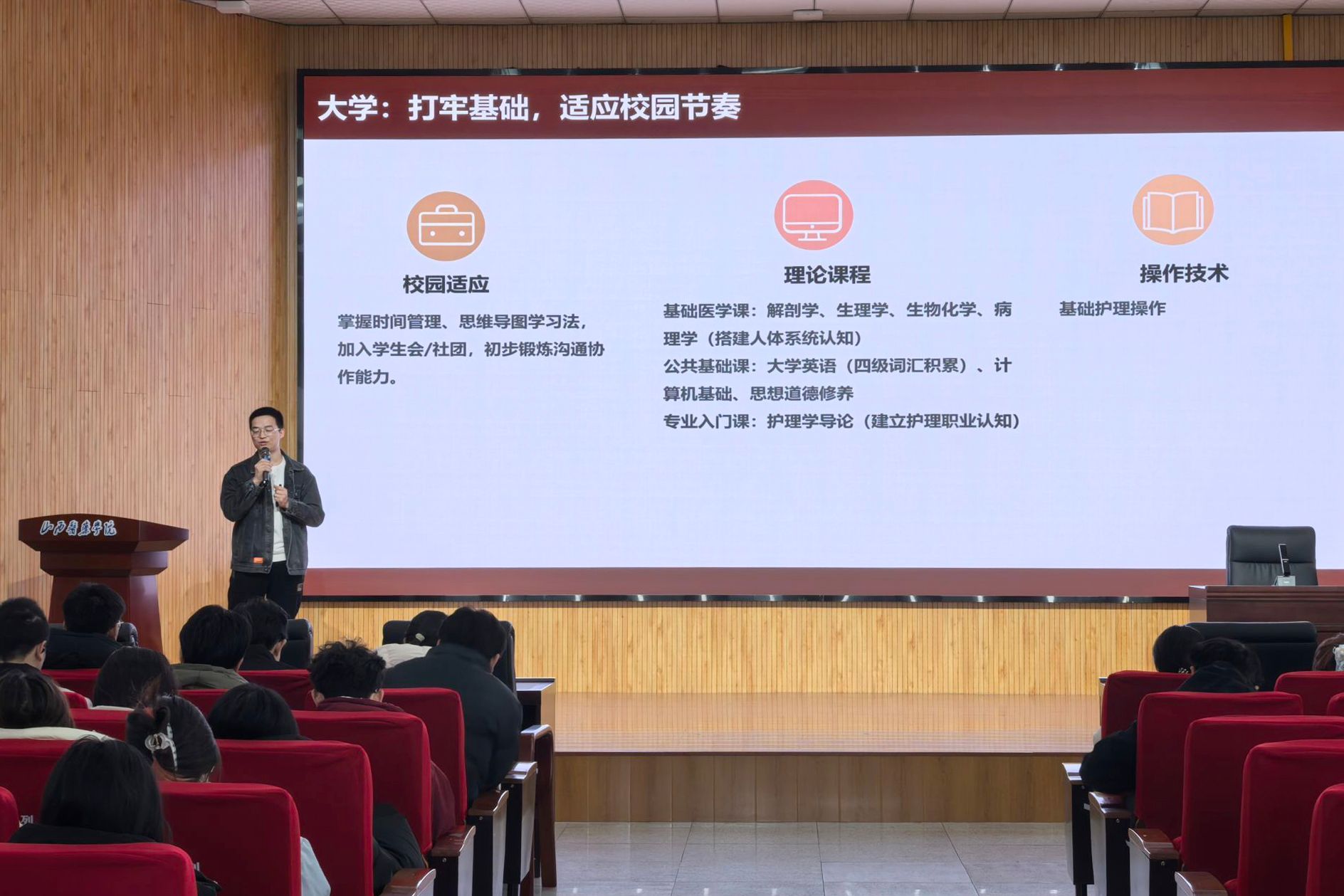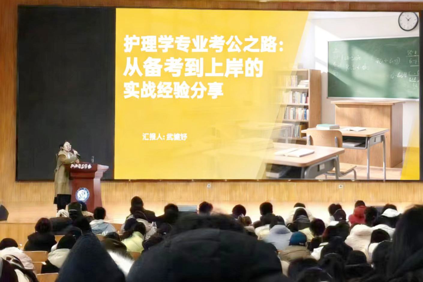 12月20日,两位2019届校友、山西省心血管病医院重症医学科的李福学和交口县回龙镇人民政府公务员的武婕妤聚焦“校友引路,多元启航”分享经验。李福学结合自身在重症医学科的成长经历,详细阐述了从学业规划到临床关键技能培养的路径,并清晰分析了临床深耕、考研深造、报考军队文职等不同发展方向的特点与要求。武婕妤分享了从护理实习到备考公务员的心路历程,细致解读了公职类考试的备考策略与技巧,为学弟学妹们展现了护理专业在公共事业领域发展的广阔前景。两位校友殷切寄语新生要坚守护理初心,深耕专业领域,笃行不怠、行稳致远。