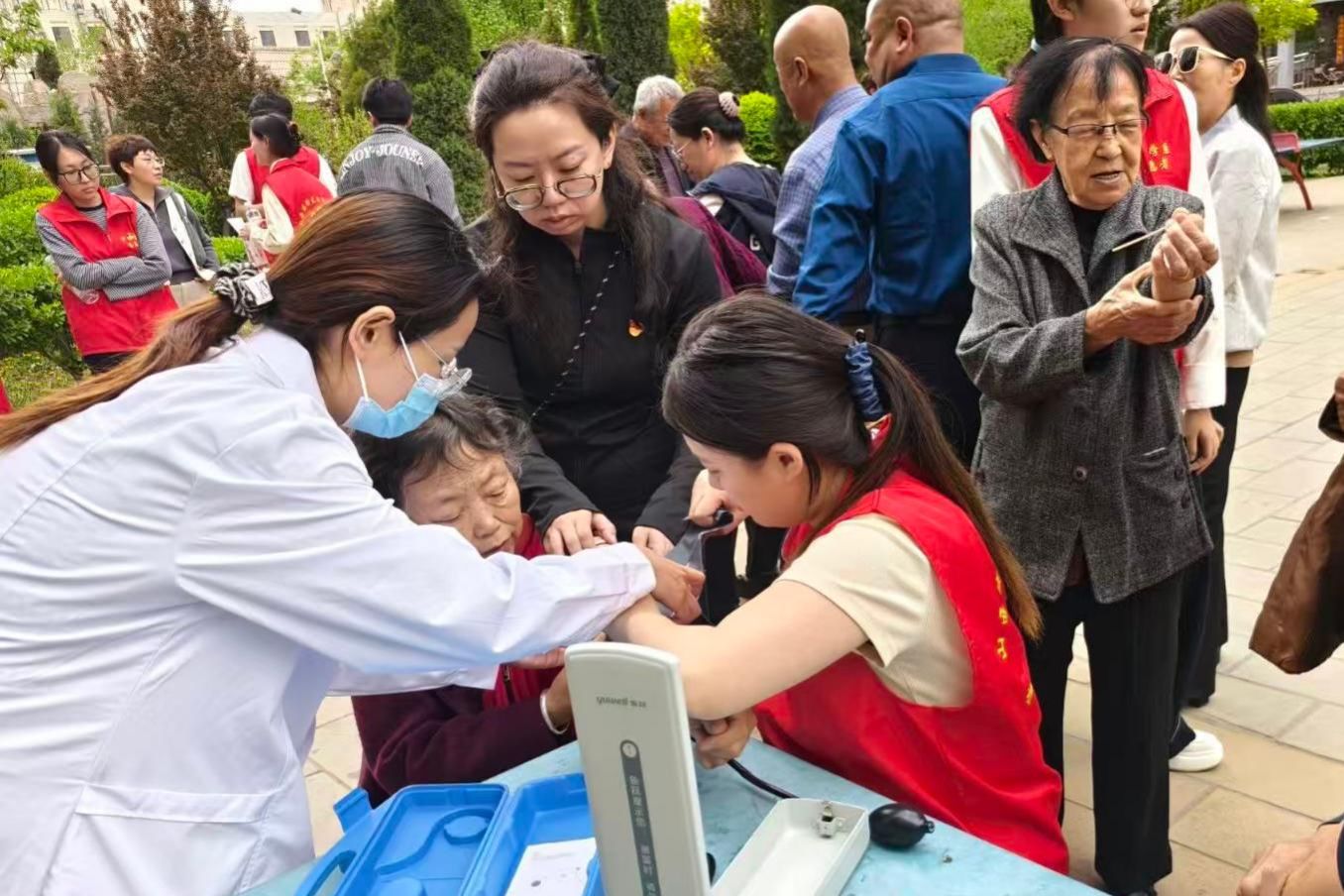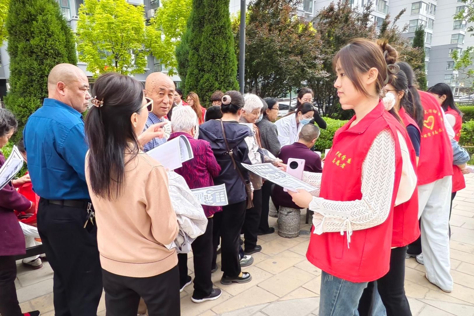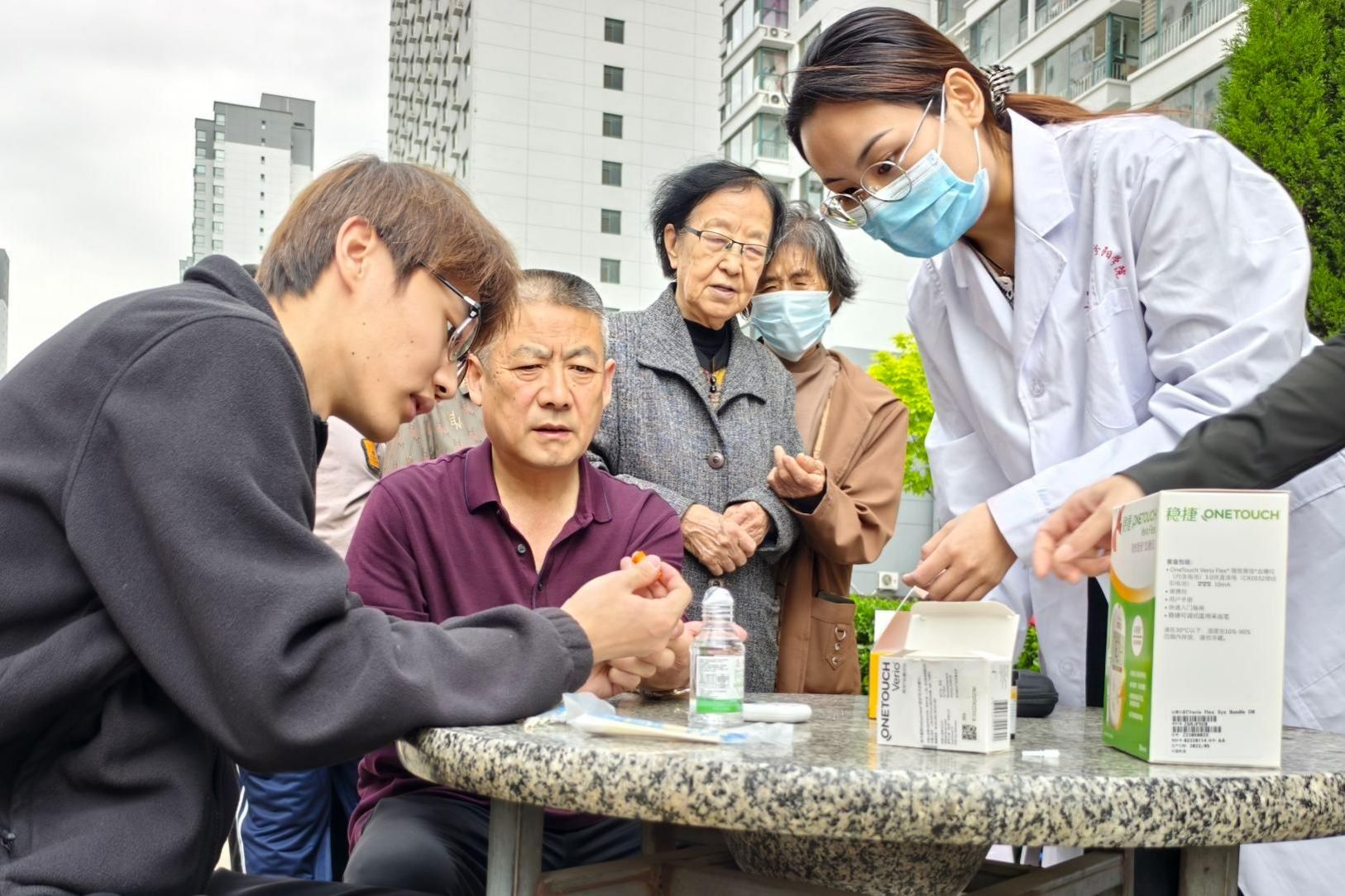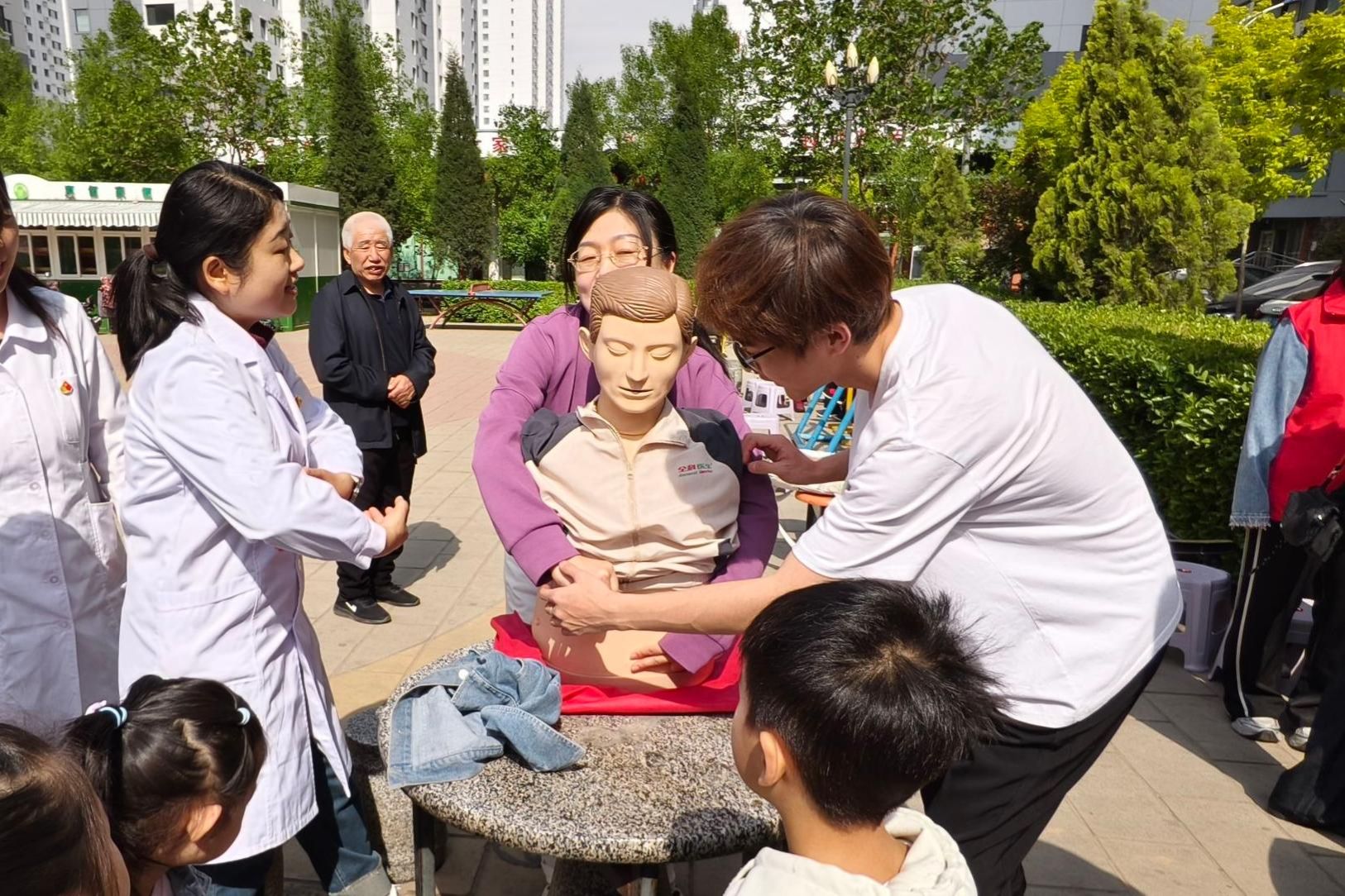 教师党员讲解了心肺复苏、海姆立克急救法、中暑晕厥应急处置、血糖监测与居家护理等居民常用急救与健康知识。老师们用通俗易懂的语言讲解要点,结合真实案例拆解操作规范,重点普及“黄金4分钟”急救理念与常见急症应对方法,把“强国行”实践要求落到实处。在老师讲解的同时,学生志愿者借助模拟人分步演示规范操作流程,手把手指导找准按压部位、控制按压深度与频率,一对一纠正动作偏差,让居民听得懂、学得会、用得上。活动现场设置健康咨询与便民服务台,师生们为社区居民免费测量血压、血糖,耐心解答高血压、糖尿病等慢性病管理、居家照护、意外伤害预防等问题,发放健康科普手册,提供个性化健康指导。
