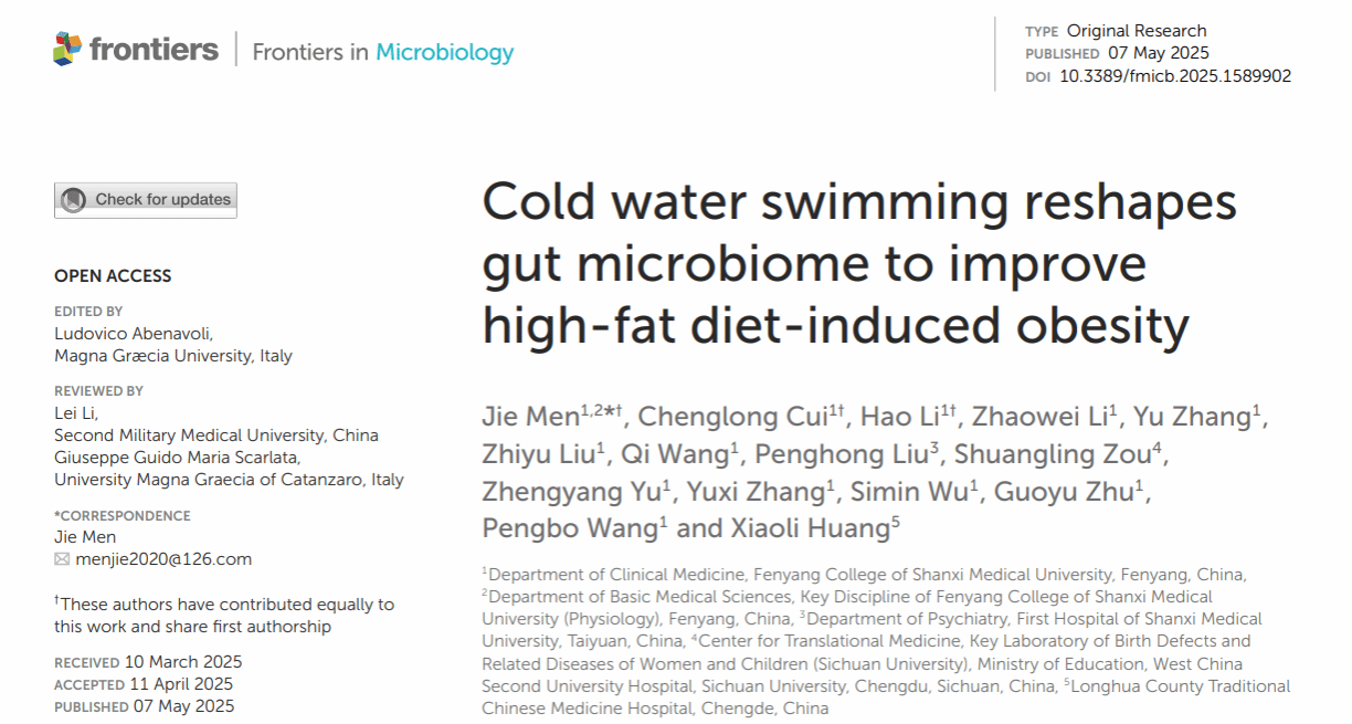 近期,我校临床医学本科专业520班学生崔程龙、李昊作为共同第一作者在微生物学领域知名期刊《Frontiers in Microbiology》(中科院二区,IF:4.5)上发表的研究论文《Cold water swimming reshapes gut microbiome to improve high-fat diet-induced obesity》引起学界同行的关注,并以“评论文章”形式在同一期刊上获得专文评述与讨论。这一突破不仅体现了我校本科生扎实的科研功底与创新能力,更成为我校深化科研育人、落实立德树人根本任务的生动实践,也标志着我校本科人才培养质量迈上新台阶,彰显了我校本科毕业生优秀的科研潜力与综合竞争力,极大鼓舞了全校学子投身科学探索、扎根医学领域的热情。