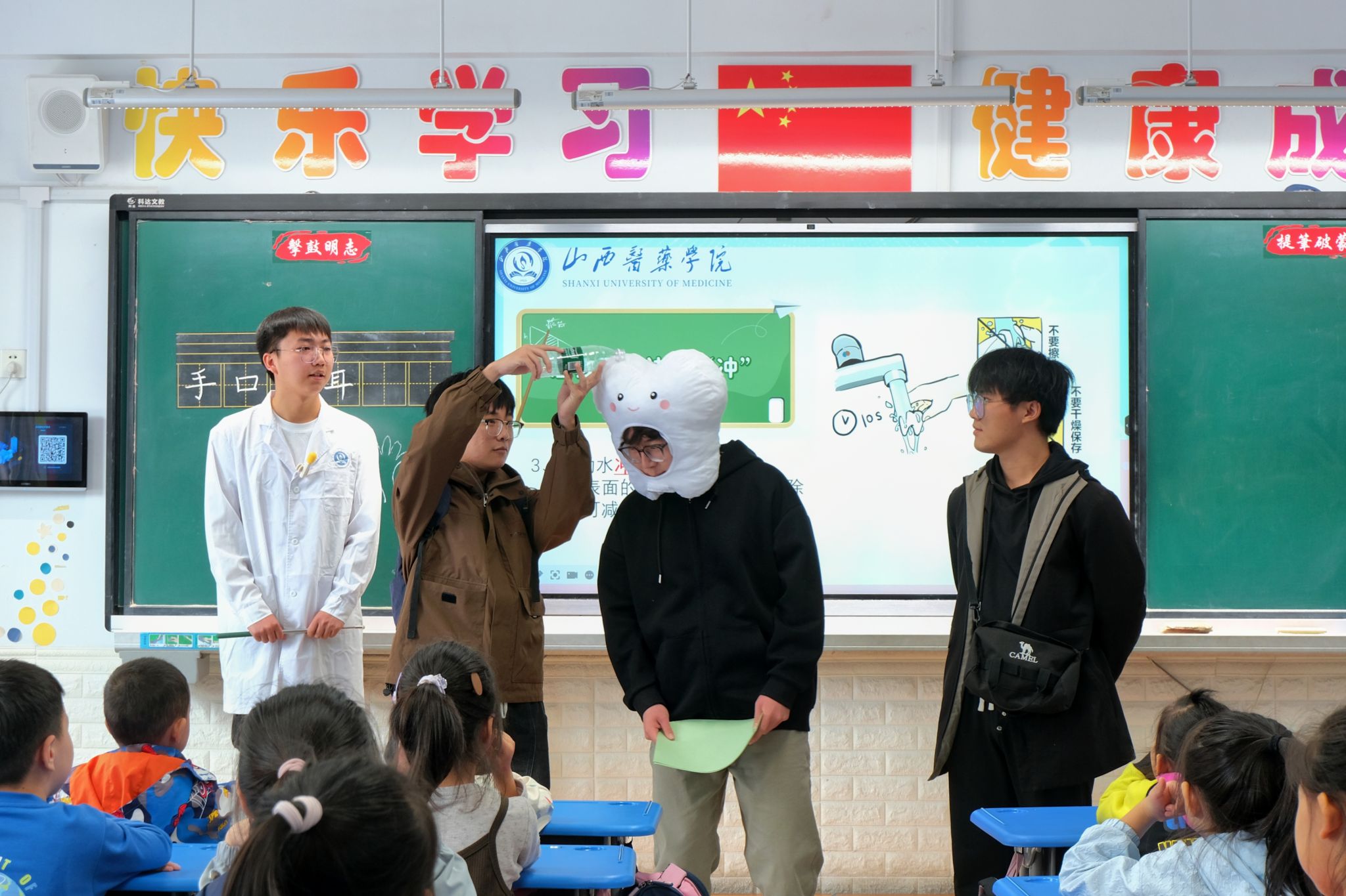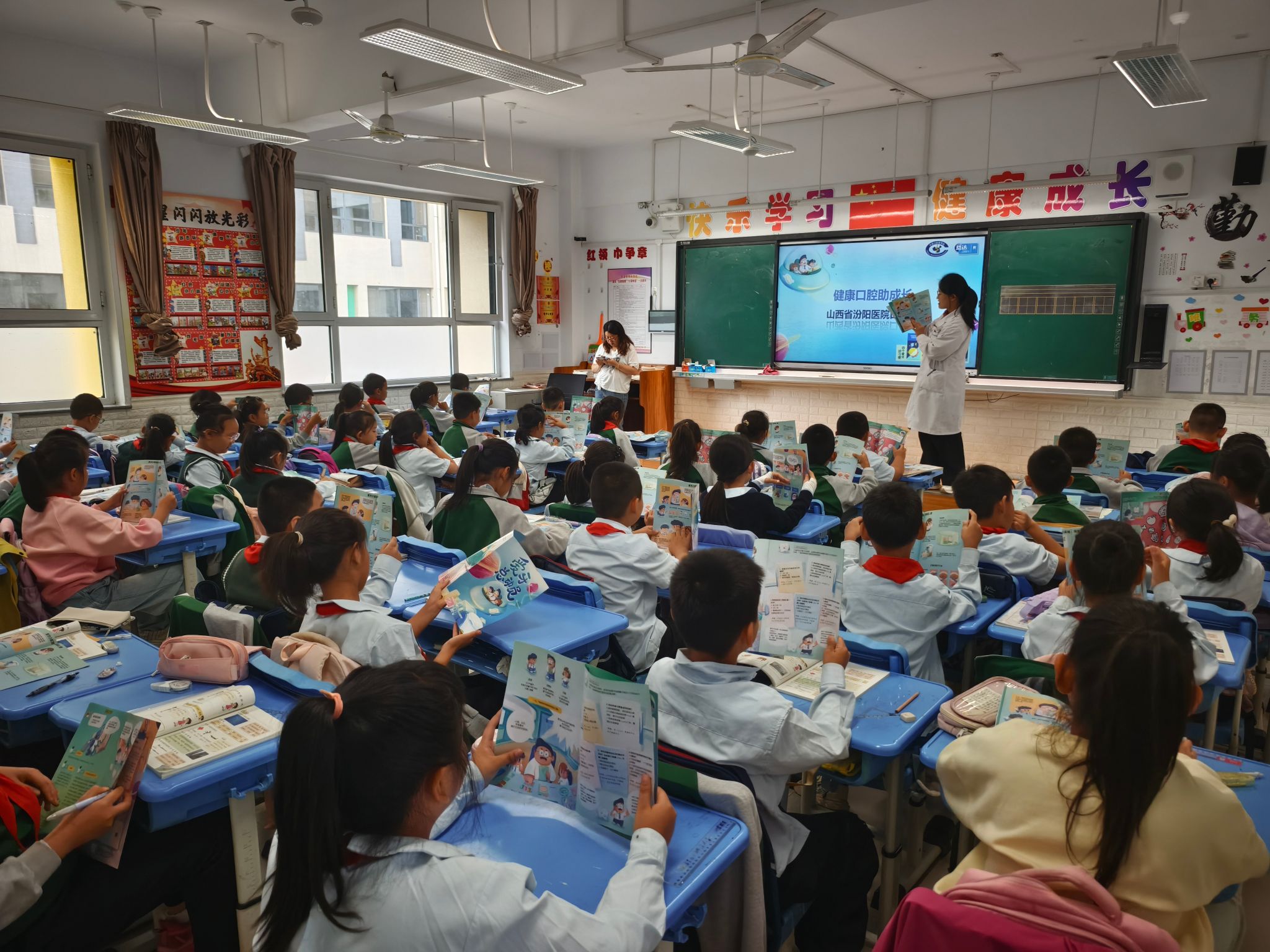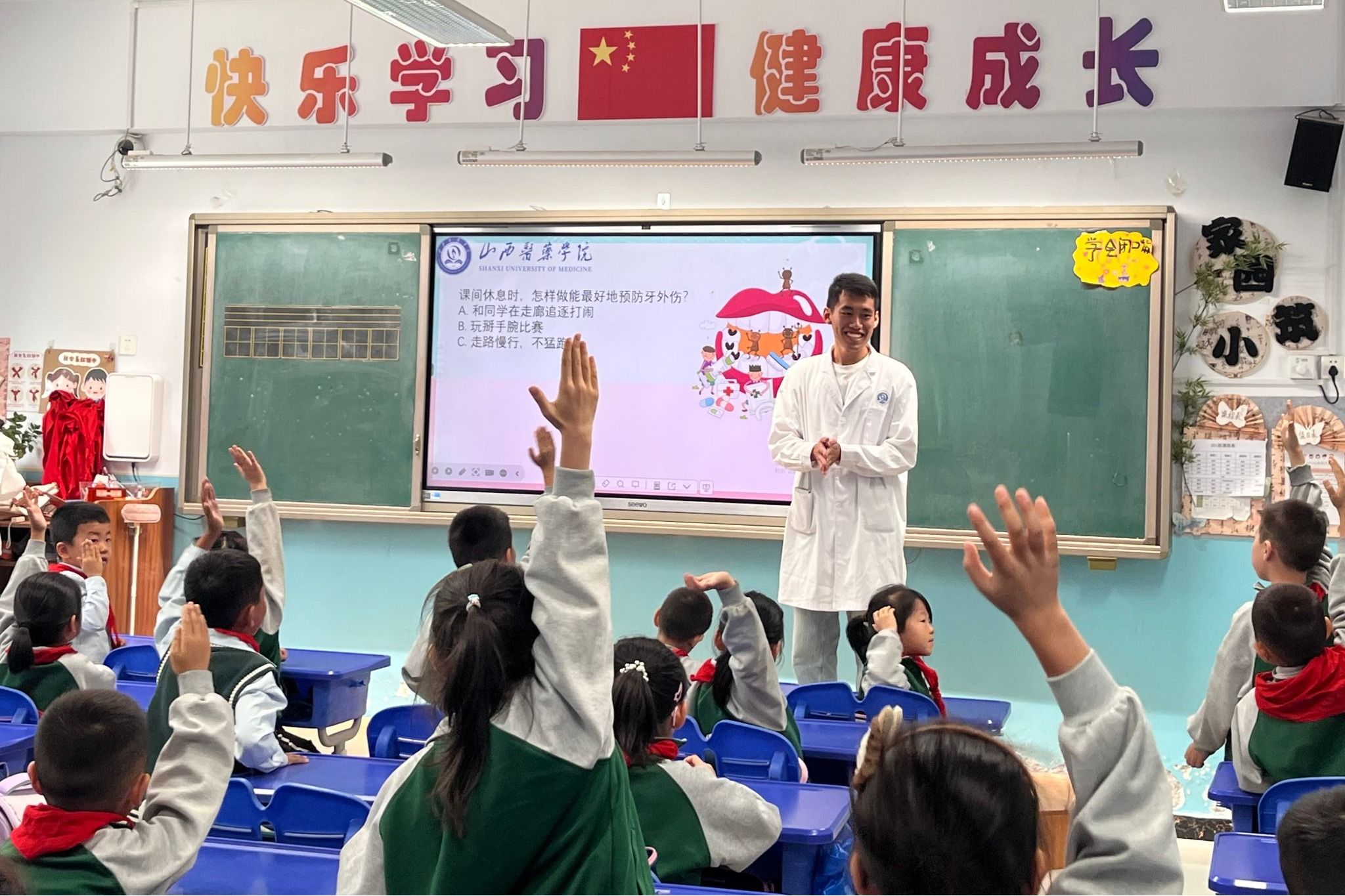 三年级课堂上,汾阳医院志愿者围绕日常口腔护理、龋齿预防等内容,通过宣讲知识手册、牙齿检查、互动问答等形式传递科学护牙理念,引发学生热烈响应。