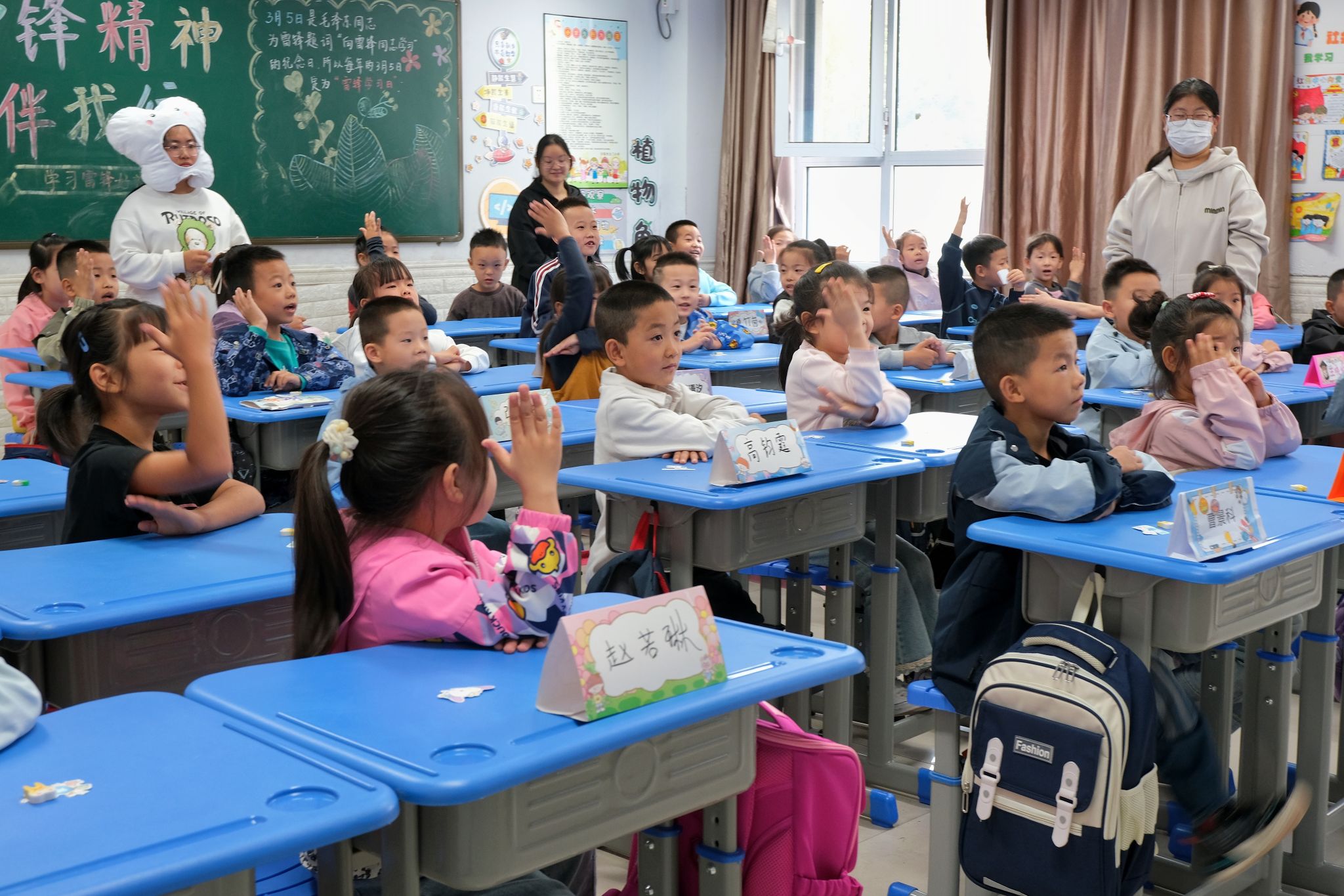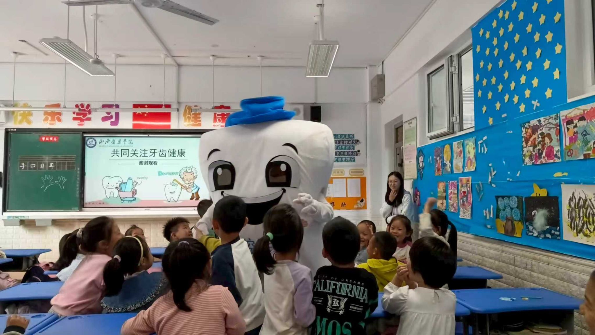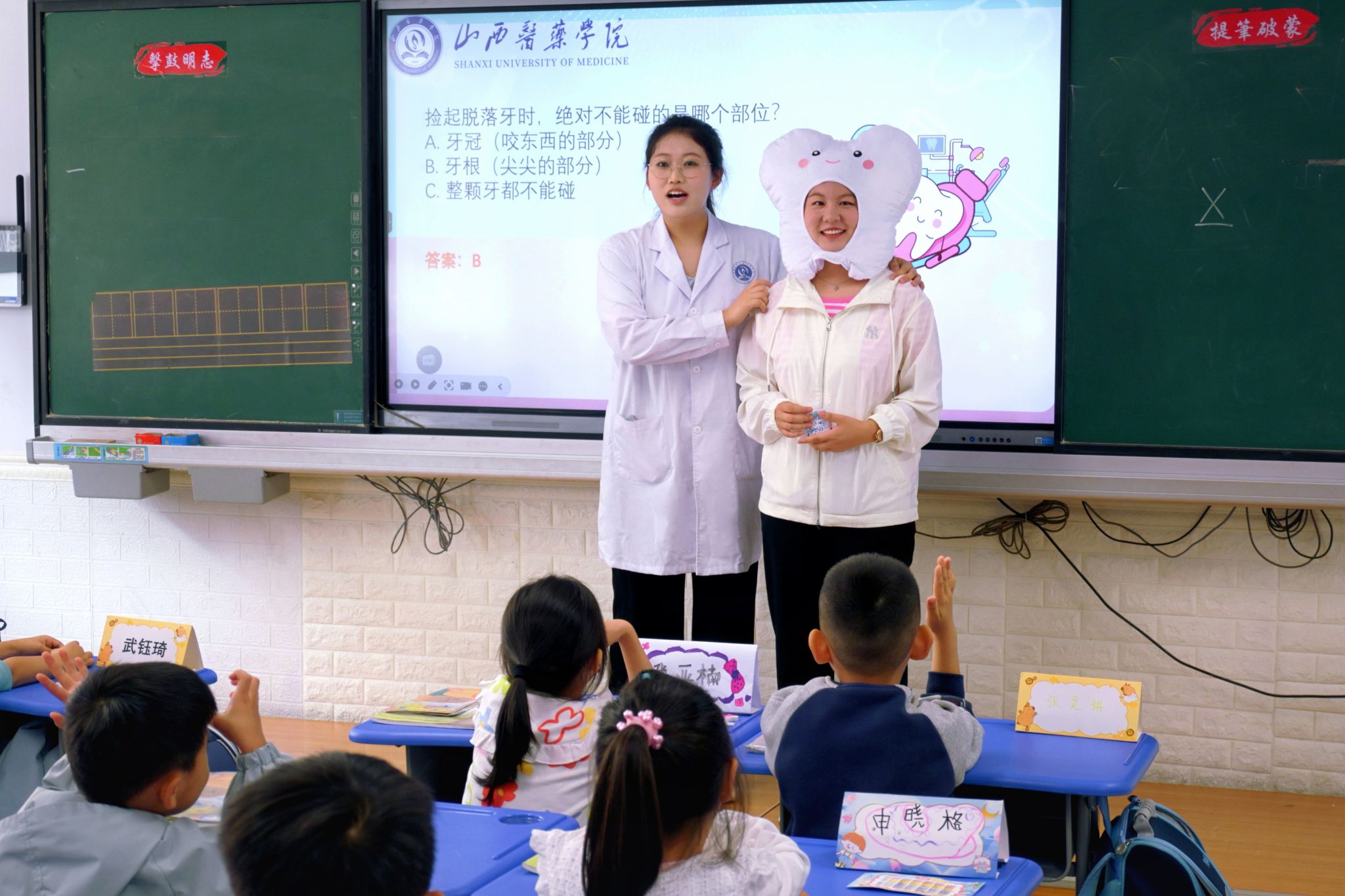 三年级课堂上,汾阳医院志愿者围绕日常口腔护理、龋齿预防等内容,通过宣讲知识手册、牙齿检查、互动问答等形式传递科学护牙理念,引发学生热烈响应。