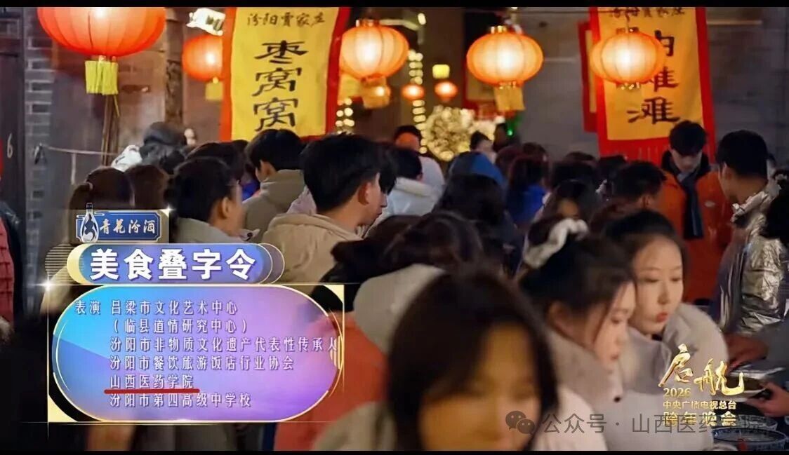 12月31日20时,中央广播电视总台《启航2026——中央广播电视总台跨年晚会》在央视综合频道(CCTV-1)、综艺频道(CCTV-3)、音乐频道(CCTV-15)等平台同步播出。作为受邀参演的高校,我校40余名学子凭借充满青春活力的出色表现,与著名演员阎鹤祥、龚韵熹等共同演绎了美食文化节目《美食叠字令》,成为这场国家级盛宴的重要参与者,向全国观众展现了山西医药学院学子的青春风采。这是我校首次登上央视晚会的舞台。