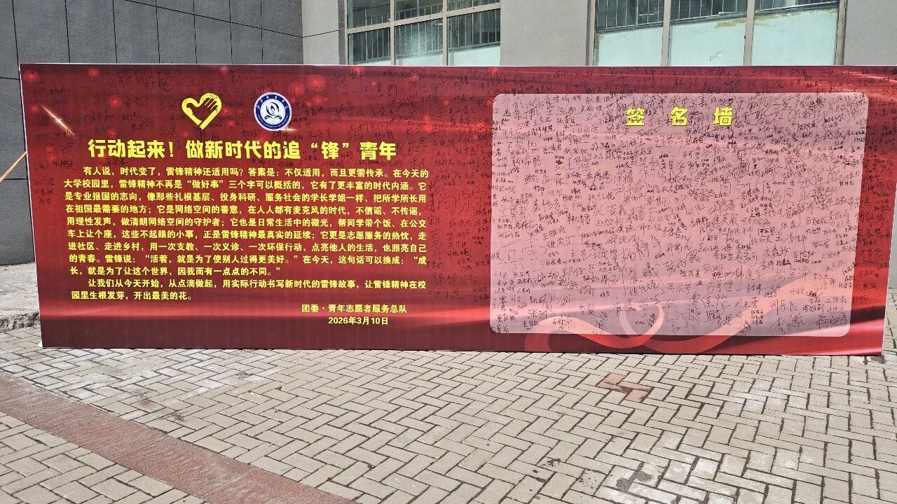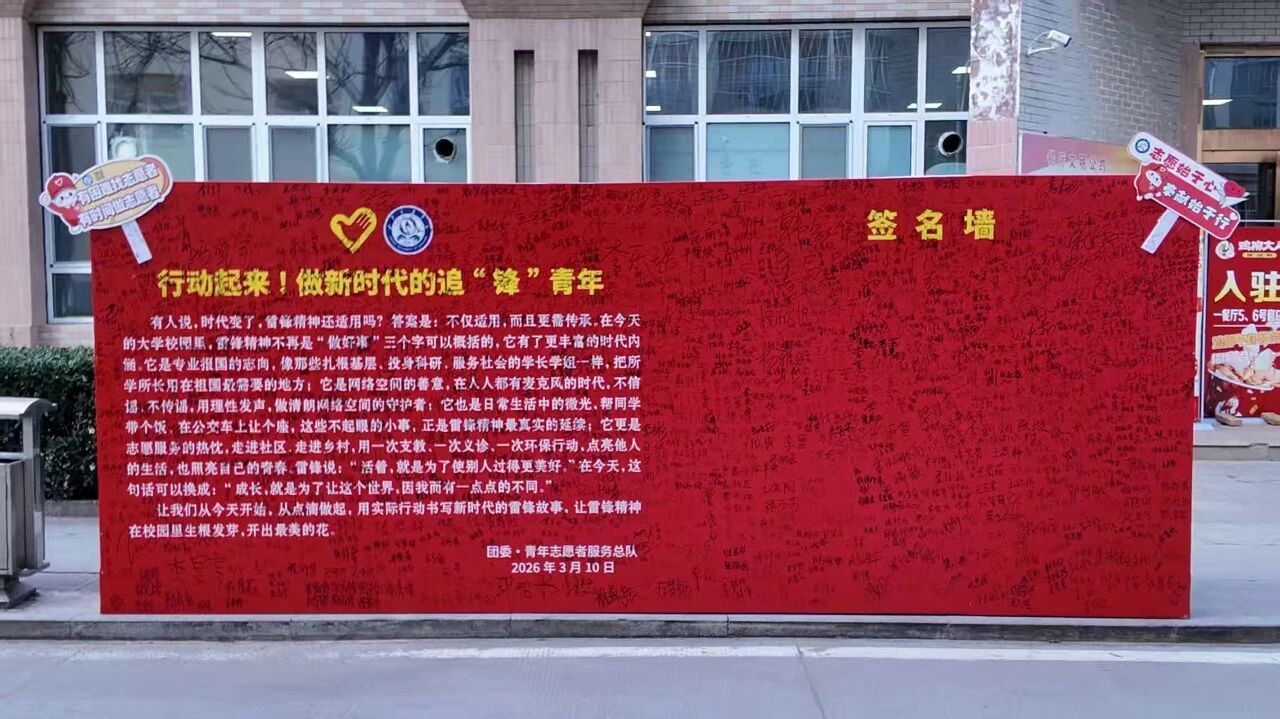 “签名传温暖,雷锋伴我行”:汾阳校区志愿者在冬青树餐厅门前开展签名承诺传温暖活动,千余名学子签署《青年志愿服务承诺书》,以仪式感强化责任意识。