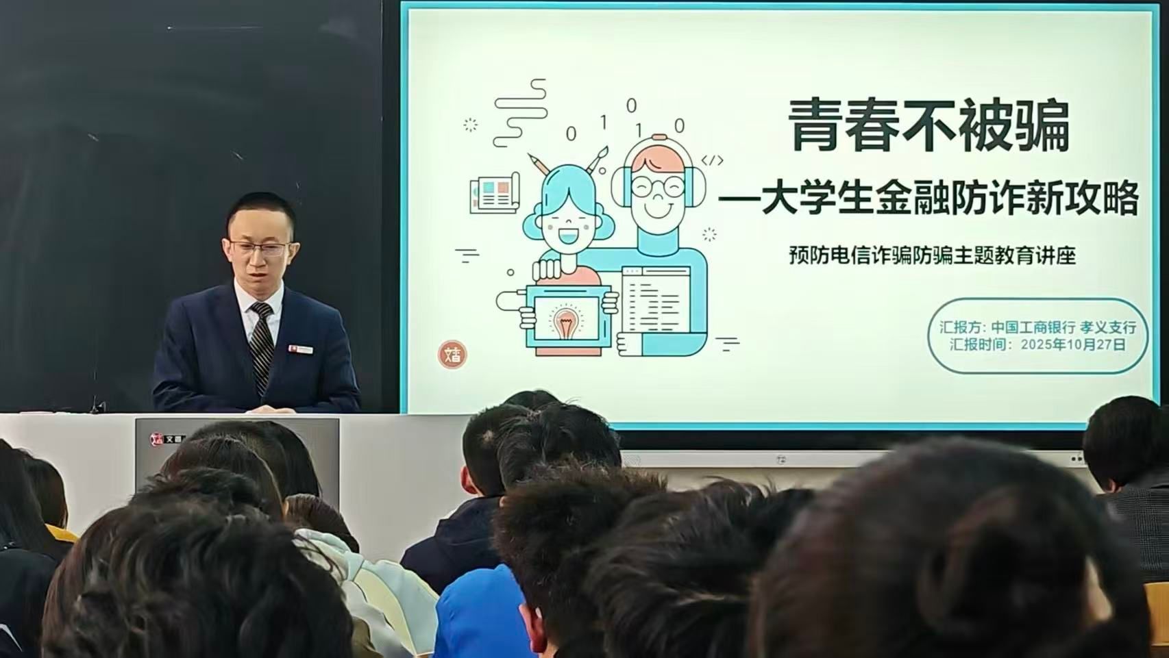 进一步提升新生防范电信网络诈骗的意识和能力,帮助新生识别诈骗套路,避免财产损失,10月27日,医学影像系联合孝义市金融监管局与中国工商银行孝义支行,共同开展了校园反诈宣传教育活动。系党总支书记褚希辉主持活动,系主任杨兴益、系党总支副书记赵彦文及辅导员董婧妍与新生参加。